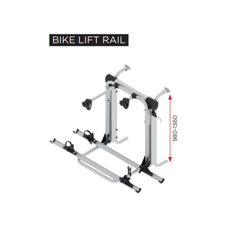 Le Bike Lift Rail de BR-SYSTEMS est un porte-vélo ascensionnel électrique pour l’équipement des camping-cars. Le modèle « rail » se fixe avec un rail en bas de la structure.