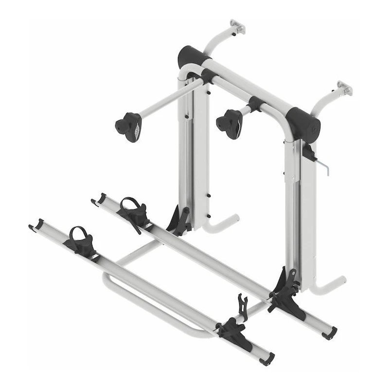 La firme Belge propose 4 modèles différents de son porte-vélos camping-car : Standard, Rail, Short et Short Rail. Ce modèle est donc la version Rail avec entraxe de montage (verticalement) réglable de 98 à 136 cm.