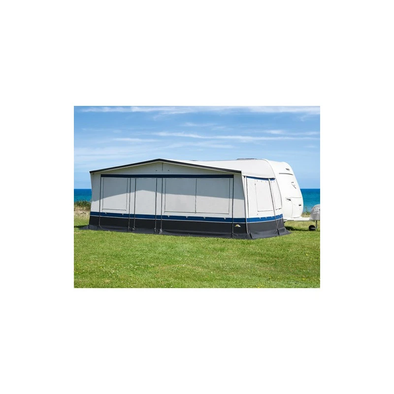 La paroi frontale est composée de 3 segments et ils peuvent donc tous être enlevés et remplacés les uns avec les autres : idéal pour un aménagement sur-mesure suivant vos besoins et votre emplacement en camping. Les fenêtres sont pourvues de volets et de fermeture éclair résistantes.