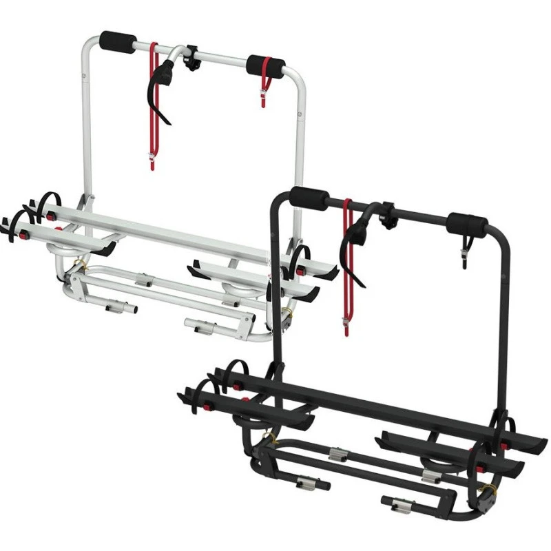 Livré de série avec 2 rails Quick Pro, 1 bras de maintien et une sangle de serrage, ce porte-vélos est un des modèles les plus aboutis du marché possédant ainsi tous les critères recherchés par les caravaniers : basculant, léger, robuste. Disponible en 2 coloris différents, aluminium ou noir, à vous de choisir la couleur qui conviendra le mieux à votre carrosserie et à votre usage.