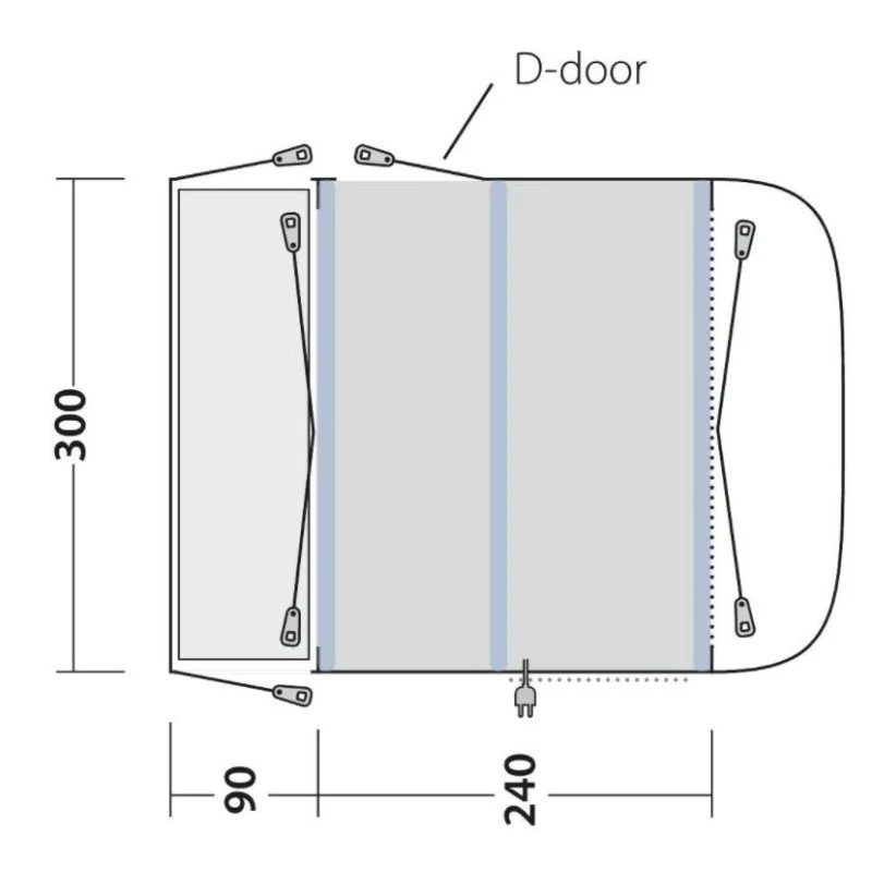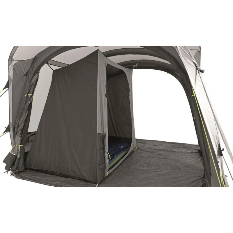L’armature en tube pneumatiques individuels se gonflent séparément grâce à des valves accessibles. Le tapis de sol intégré permet un accès propre et stop les courants d’air et la pénétration des insectes rampants. Des crochets à l’intérieur du auvent, vous permettent de venir suspendre des câbles ou des accessoires légers et est doté d’un passe câble.