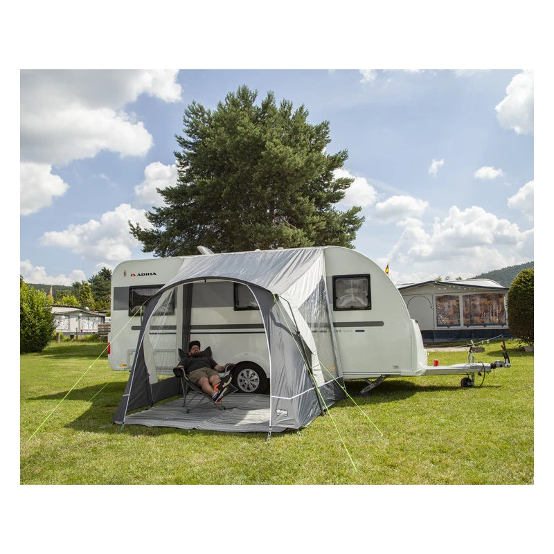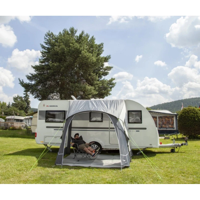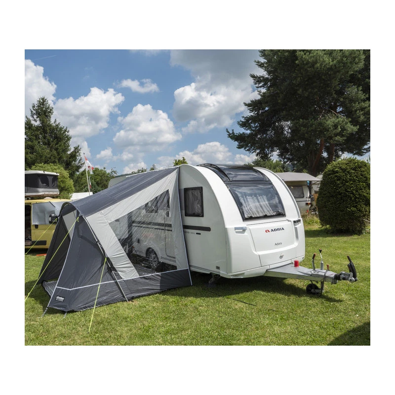 Parfait pour profiter de l’extérieur de votre caravane, cette solette est parfaite pour se protéger du soleil, du vent et des pluies légères. Elle est surtout conçu pour les arrêts cours car elle ne se ferme pas sur la façade. Avec ses deux parois vitrées, cet auvent pour caravane coupe bien du vent sans gêner l’entrée de lumière !