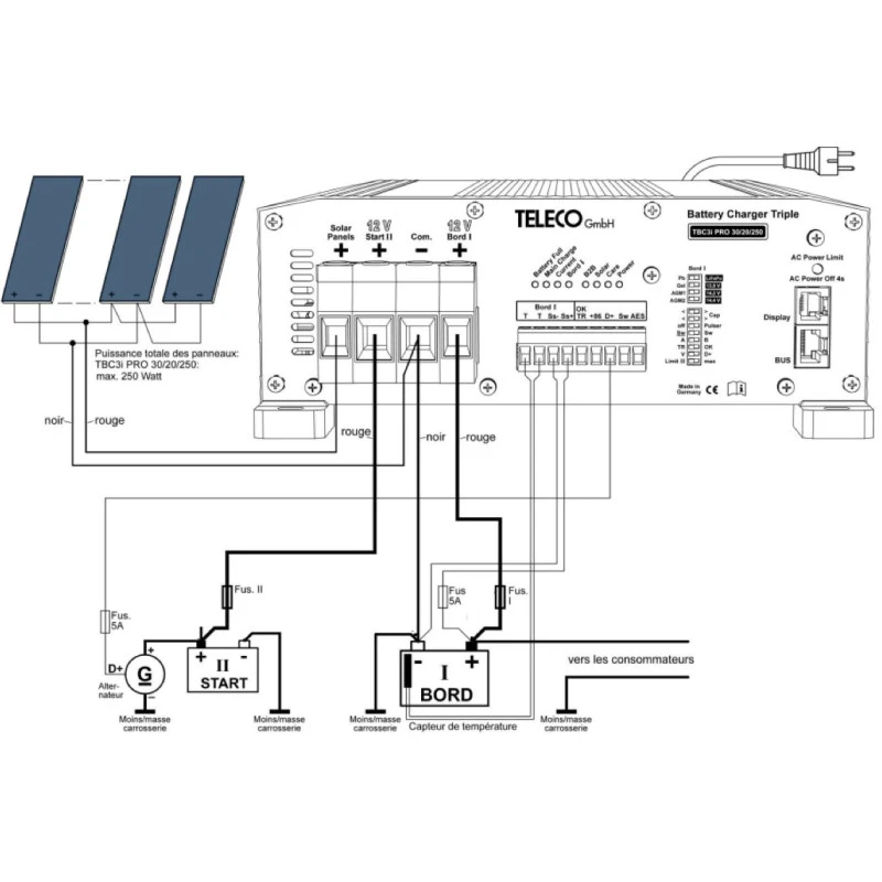 Lorsque vous êtes à l’arrêt, c’est les panneaux solaires 12V qui prennent le relais. Le TBC3i PRO 30/20/250 Multicharger intègre un régulateur MPPT pouvant accepté une puissance de panneau de 250 W !