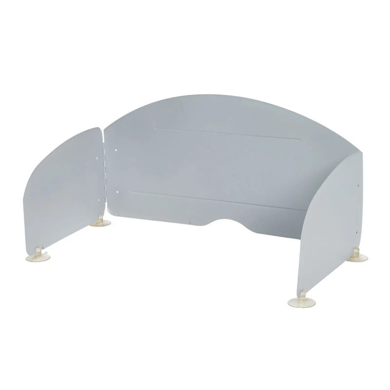 Pare-feu pliant avec 4 ventouses pour le fixer facilement sur tous vos dessus de meuble de cuisine. Ce pare-feu est conçu pour abriter la flamme de votre réchaud du vent. Cet accessoire pliant est indispensable pour tous les caravaniers qui ne disposent pas de pare-feu intégré à leur réchaud ou à leur mobilier. En acier laqué, ce pare-feu résistant se replie en deux pour un gain de place lors du rangement de votre équipement plein air.