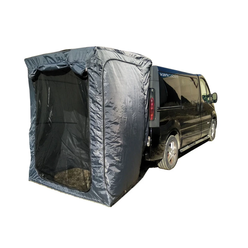 La tente arrière VANCABIN est équipée de trois ouvertures : une porte latérale, une porte frontale et une cloison à fermeture éclair entre la tente et l’intérieur de votre van aménagé.
